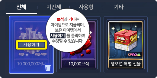 º¸À¯ ¾ÆÀÌÅÛ¿¡¼ [»ç¿ëÇϱâ]¸¦ Ŭ¸¯ÇÏ¿© ¼ö·ÉÇÒ ¼ö ÀÖ½À´Ï´Ù.